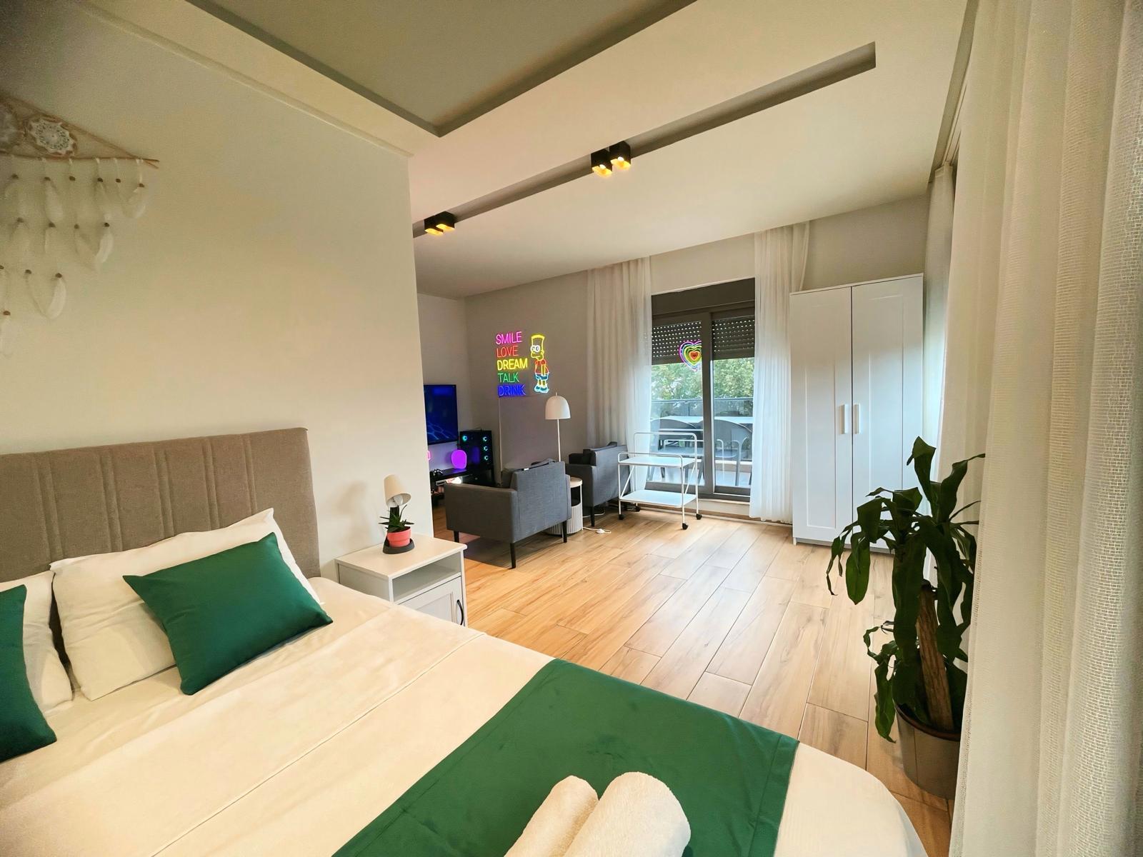 İki yatak odası ve iki banyoya sahip olan bu 2+1 günlük kiralık daire, maksimum 5 kişiye kadar konaklama imkânı sağlar. Geniş yaşam alanı, tam donanımlı mutfak, hızlı Wi-Fi ve klima gibi olanaklarıyla özellikle aileler ve uzun süreli konaklamalar için idealdir